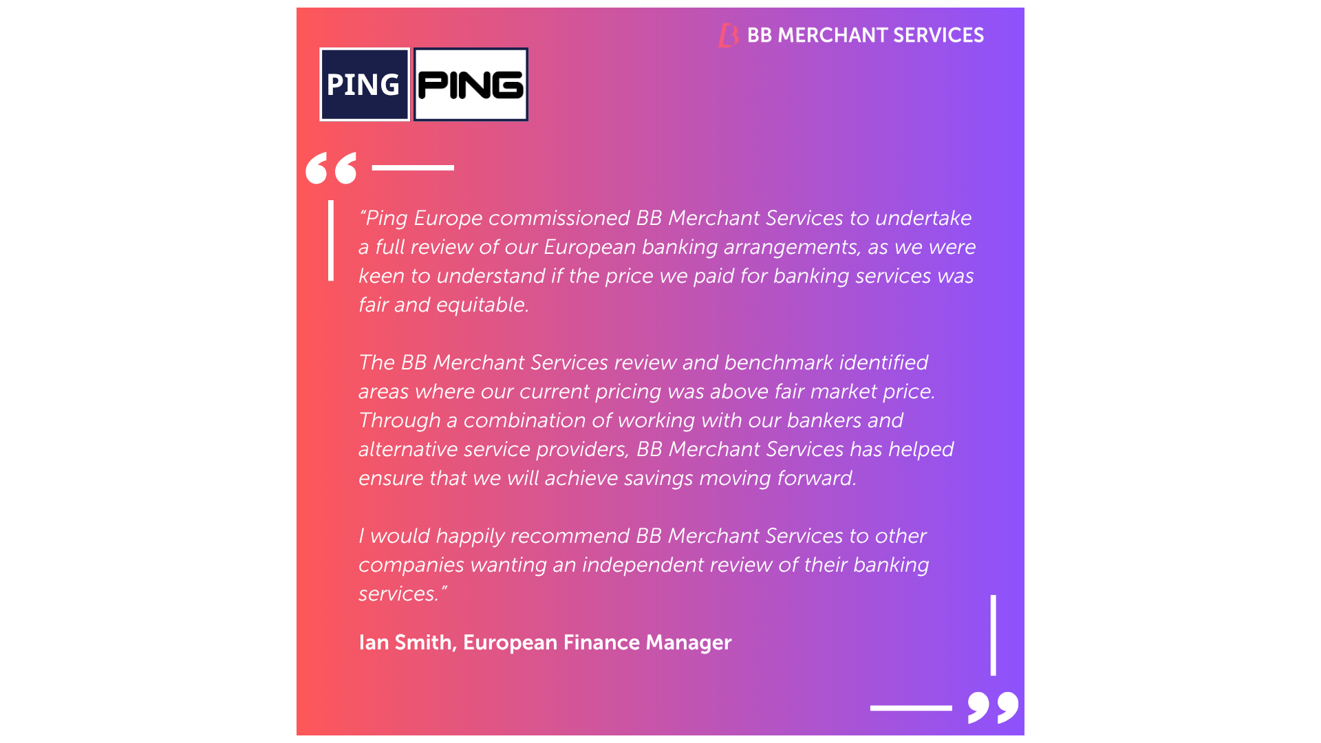 PING, a globally recognised golf brand, undertook a strategic review of its European banking arrangements to determine whether it was paying fair and equitable rates for its banking services.