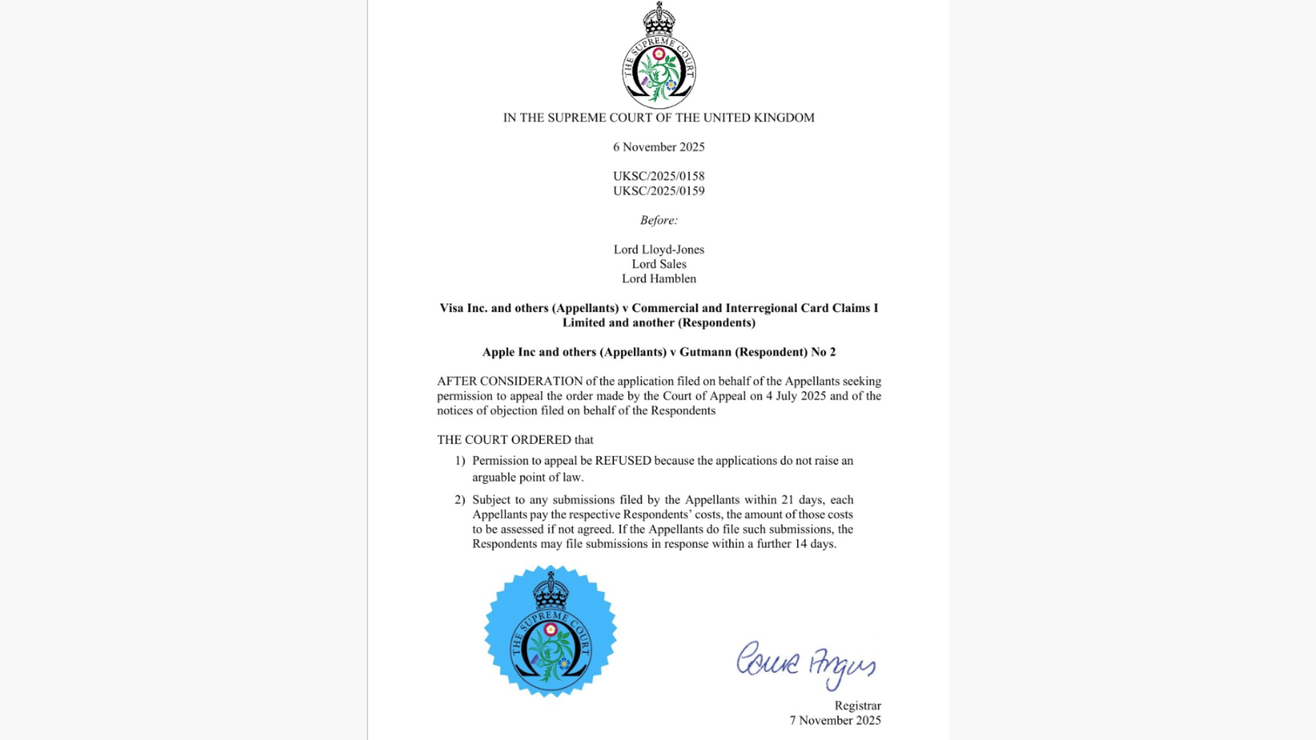 The Supreme Court has refused Visa and Mastercard permission to appeal in Visa v CICC and Apple v Gutmann